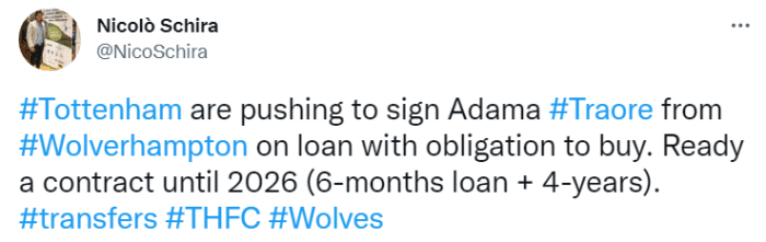 JRS直播网01月14日讯 据记者斯基拉报道,热刺准备以先租后买的方式签下狼队边锋阿达马-特劳雷。