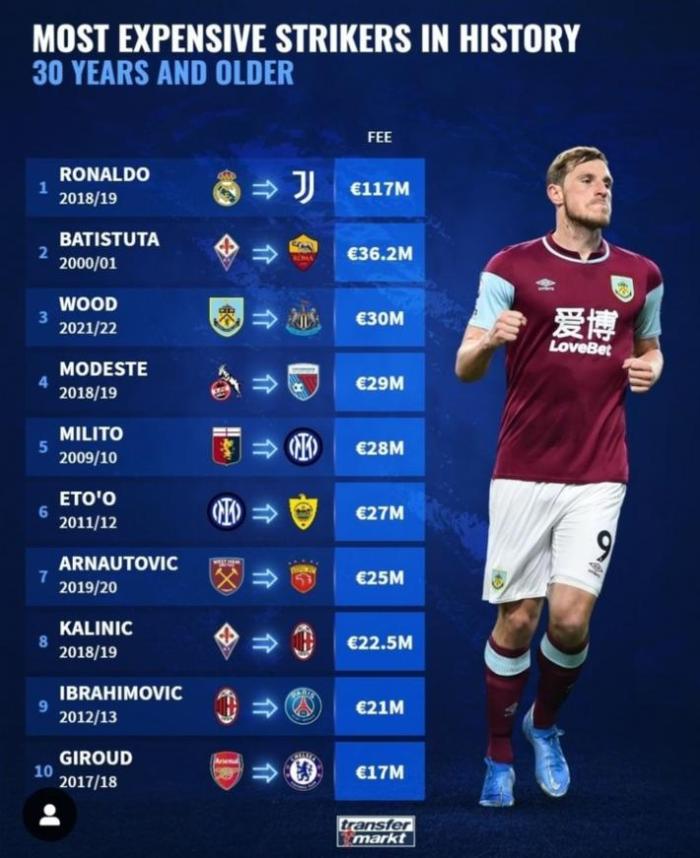 JRS直播网01月14日讯 ,纽卡斯尔联官方宣布从伯恩利签下新西兰中锋克里斯-伍德。据德国转会市场网透露,克里斯-伍德的转会费在30岁以上前锋中排在第三,仅次于C罗和巴蒂。