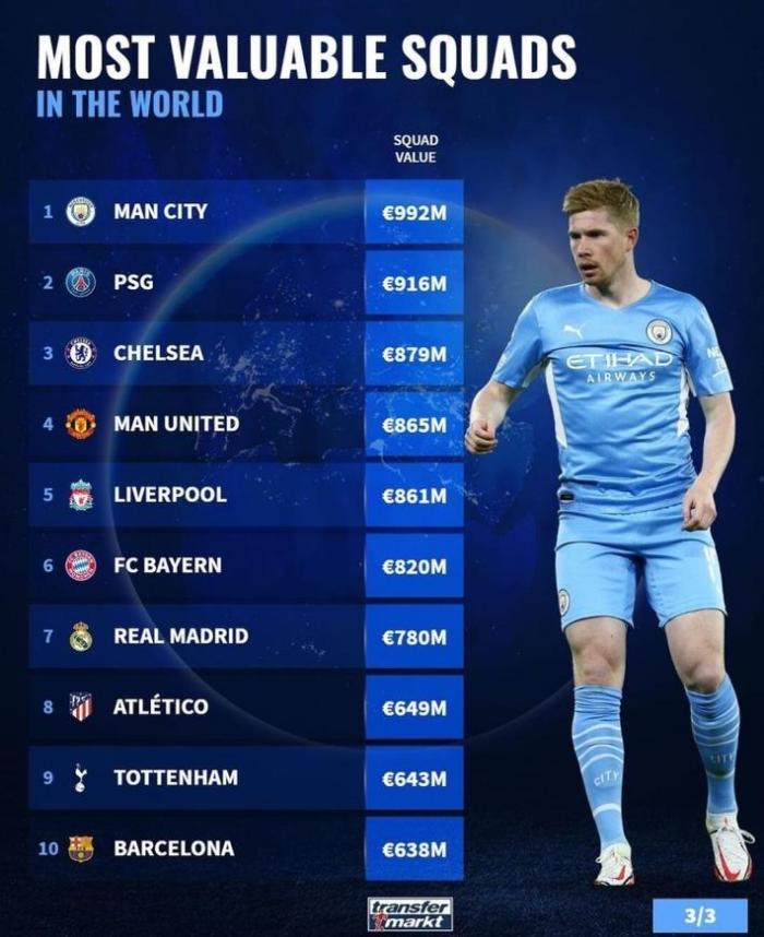 JRS直播网01月09日讯 ,德转更新了当今世界足坛最新的球队身价榜,曼城9.92亿欧元高榜首,巴黎9.16亿欧元位居第二,前五中有4支英超的球队。