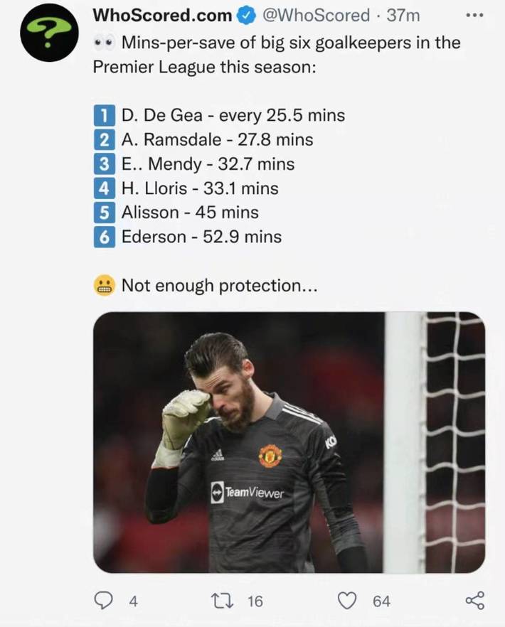 JRS直播网01月05日讯 ,著名媒体whoscored统计了截至目前英超BIG6门将的扑救频率情况,德赫亚高居榜首。