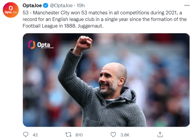 2021年,曼城在各项赛事取得53场胜利,这是自英格兰联赛1888年创立以来,单支球队单个自然年的胜场纪录。