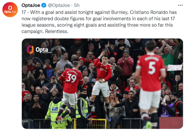 统计表明,C罗已经连续17个赛季在联赛中直接参与10球以上,堪称足坛最稳定的球员。