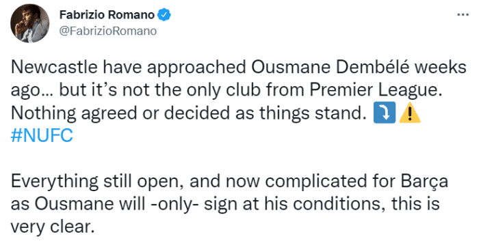 罗马诺表示,纽卡在几周前就接触了登贝莱,但他们不是唯一一支对登贝莱感兴趣的英超球队,目前为止一切都还没有定论。