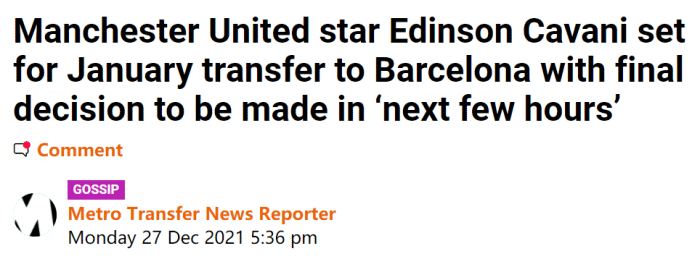 在曼联已经进行的17轮英超比赛中,对纽卡之战仅是卡瓦尼第6次参赛。西班牙《每日体育报》称,虽然红魔俱乐部希望挽留卡瓦尼,但球员本人更希望离队,该报披露,卡瓦尼已经同意巴萨的合同,接下来就看曼联是否放行。