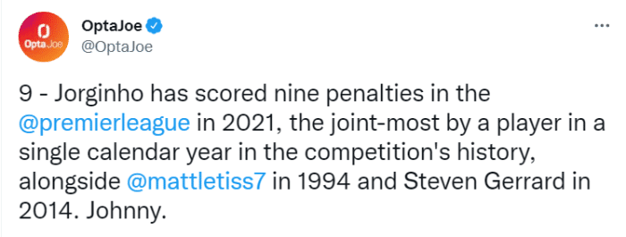 半场结束时,知名数据网站OPTA统计,若日尼奥已经在2021年英超联赛打进9粒点球,追平了南安普顿名宿“上帝”勒蒂塞尔在1994年以及利物浦名宿杰拉德在2014年的纪录。