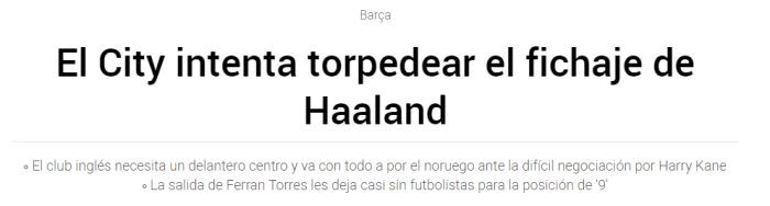 《每日体育报》最后表示,哈兰德和拉伊奥拉将在一月开始考虑未来,届时巴萨也将加入战局,现在这支加泰罗尼亚俱乐部正在筹集引进哈兰德的资金。