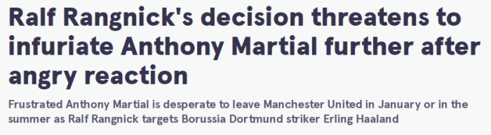 《镜报》表示,曼联视哈兰德为重要引援目标,朗尼克希望如果球队签下这位挪威前锋的话,马夏尔能够让出自己的9号球衣,这让马夏尔十分不满,因为在之前伊布加盟时,马夏尔就让过一次9号球衣。