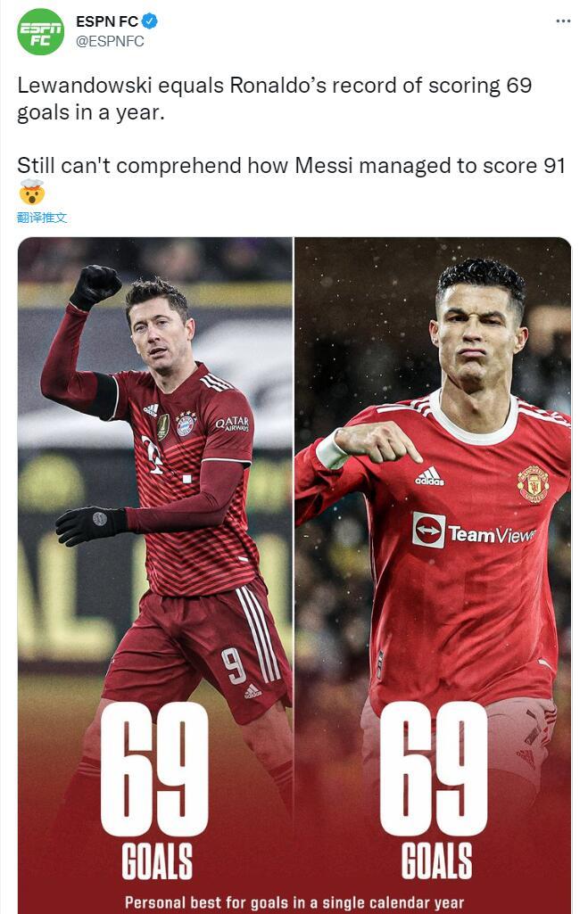 JRS直播网12月19日讯 消息,莱万对沃尔夫斯堡破门后,追平C罗的年度69球纪录,ESPN感叹不知道梅西年度91球是怎么做到的。