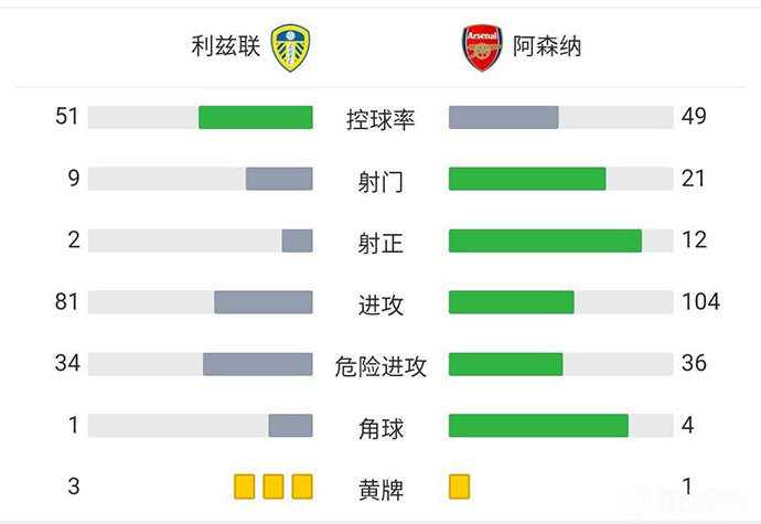 第42分钟,萨卡反越位成功,接球后内切突破到禁区内,左脚劲射破门,阿森纳3-0利兹联!