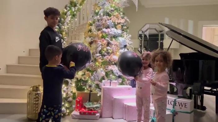 在视频中,C罗长子迷你罗和其他3兄妹拿着两只气球,在乔治娜「3、2、1」的倒数结束后,气球被扎破,里面分别喷洒出粉红色和蓝色的彩色纸屑。