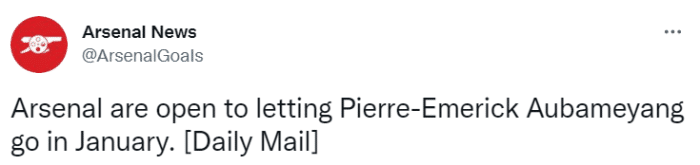 阿森纳愿意在1月就把奥巴梅扬送走,他们会听取来自各方的报价,不过《邮报》认为赛季结束才是奥巴梅扬最可能离开的时间。