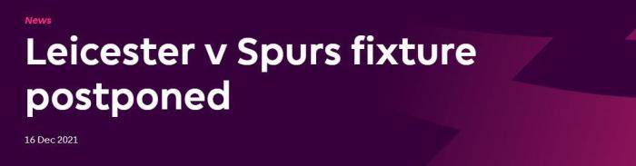 JRS直播网12月17日讯 ,英超联赛官方宣布,本轮莱斯特城主场与热刺的联赛推迟。