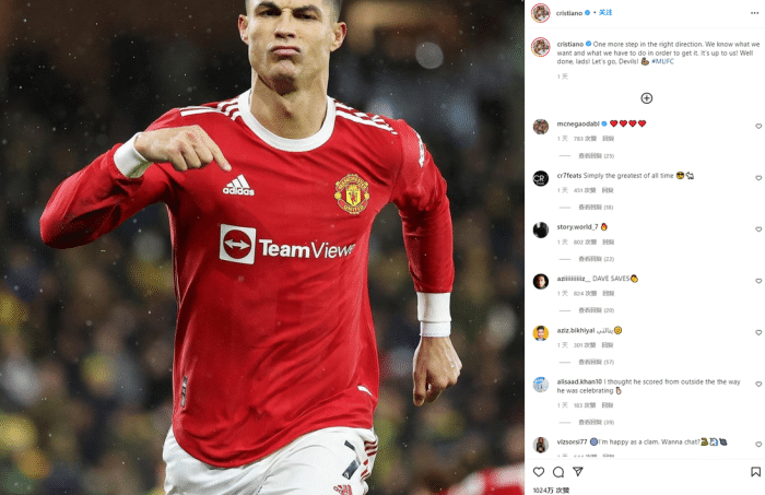 C罗在曼联1-0小胜诺维奇的比赛中打进全场唯一进球,帮助红魔取得3分。赛后他晒出自己的照片并写道:“又朝着正确的方向迈出一步,我们知道自己想要的是什么,也知道该做什么来实现这些目标。这一切都取决于我们自己,干得很好伙计们,继续前进,红魔!”