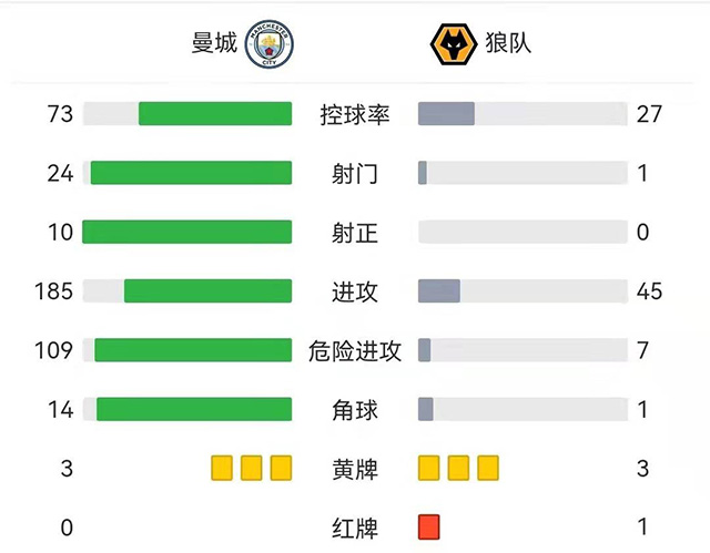 JRS直播网讯:北京时间12月11日晚间20:30,英超联赛第16轮,曼城主场迎战狼队。上半场,坎塞洛传射多次造险,鲁本-内维斯与基尔曼头部相撞,两人血染赛场,希门尼斯补时阶段,1分钟内连续吃到两张黄牌被罚下。下半场,考迪门线极限救险,伯纳多-席尔瓦造点,斯特林点射破门,基尔曼险些绝平。最终,曼城1-0险胜狼队。