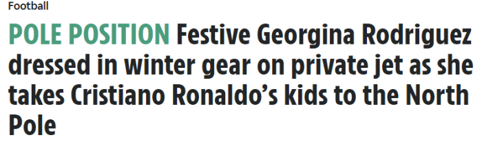 《太阳报》表示,C罗的女友乔治娜在个人社交媒体上晒出了自己与4个孩子在飞机前的合影,据悉他们将是乘坐私人飞机,前往北极过圣诞节。