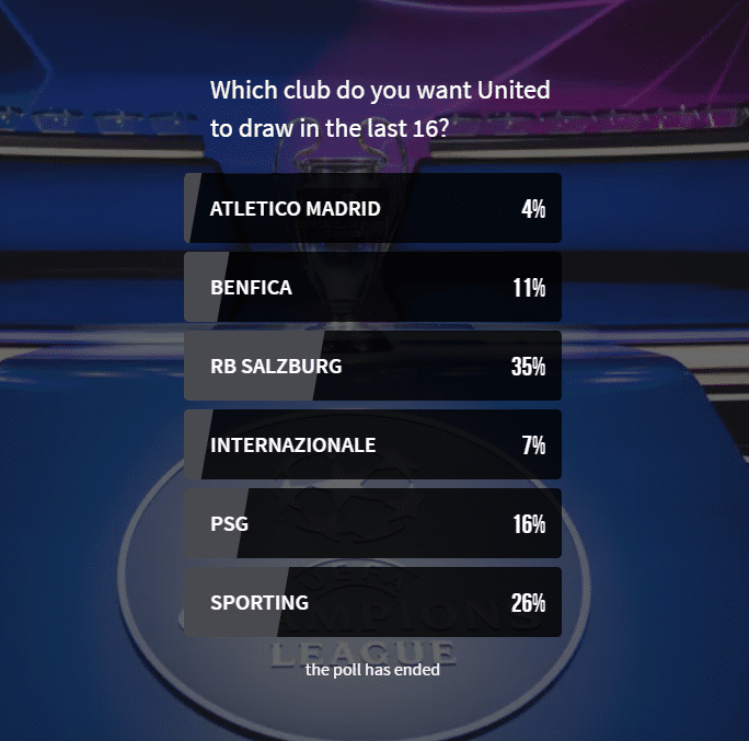 JRS直播网12月10日讯 曼联日前在官网向球迷发起调查,了解球迷最希望在欧冠16强遇到哪支球队,最终萨尔茨堡红牛排名第一。