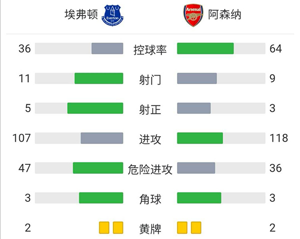 全场比赛结束,埃弗顿2-1阿森纳。