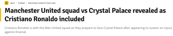 《曼晚》表示,C罗的伤势没有大碍,他入选了曼联对阵水晶宫的比赛大名单。本场比赛将是朗尼克上任后的首场比赛,除了C罗外,马蒂奇和万-比萨卡也从伤病中恢复。