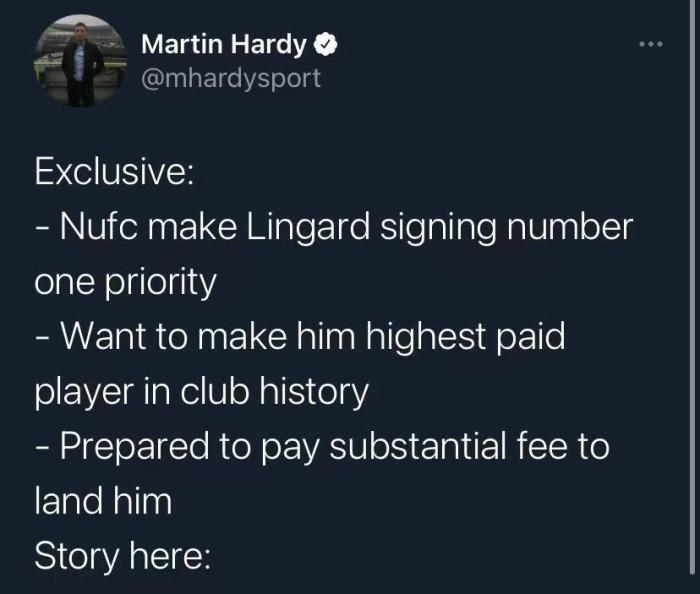 该记者表示,纽卡将林加德视为冬窗引援的第一目标,他们将给林加德提供球队历史上的第一高薪,而且他们愿意为林加德支付一比转会费,尽管他的合同只剩半年了。