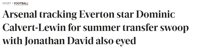 JRS直播网12月04日讯 据伦敦当地媒体《伦敦晚旗报》报道,阿森纳有意在明年夏天签下卡尔沃特-勒温和乔纳森-戴维来补强锋线。