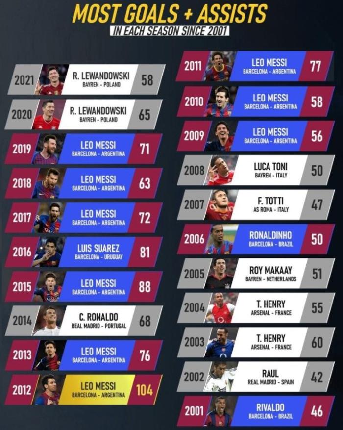 VeronicaBrunati认为足坛还欠梅西两座金球奖。近两年莱万多夫斯基位居进球和助攻榜的第一位。