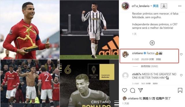 随后,C罗本人也现身该动态的评论区,他不仅评论道:事实(factos),甚至还配上了点赞和眼睛的表情。显然,他非常认可这位球迷的说法。由于今年梅西当选金球奖,立志要当史上第1人的C罗,已经在金球奖数量上5-7落后于梅西。考虑到C罗已经36岁,未来他能否追上甚至反超梅西,无疑是个不小的疑问。