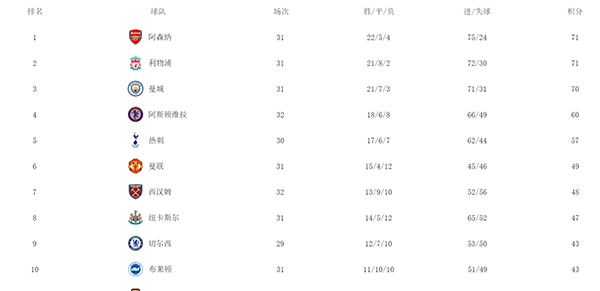 最大的赢家要说是阿森纳,因为利物浦的丢分,所以他们重新回到联赛第一的位置,而且即便是积分相同的情况下,进攻火力第一的阿森纳也有净胜球的优势,这点对于三队争冠的形势来看,是非常重要的,他们已经打进75个进球,丢了24球,净胜球51个也是联赛最多的。利物浦的净胜球是42个。