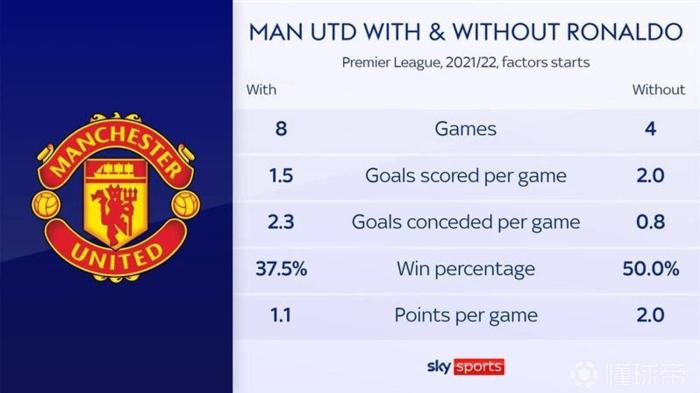 如图,《天空体育》统计,本赛季C罗8次首发,曼联场均进球1.5球,场均丢球2.3球,场均积分1.1分,胜率只有37.5%。而C罗替补出场的4场比赛,曼联场均进球2球,场均丢球0.8球,场均拿分2分,胜率50%。从数据显示来看,C罗替补出场的时候,曼联的战绩更好,无论是进攻端还是防守端的表现都更好,而他们的言外之意就是C罗更应该替补了?