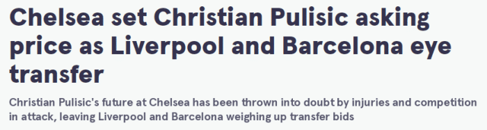 不过切尔西方面不会如此轻易将普利西奇放给争冠对手,他们为美国人标价4200万英镑,此外巴萨也对普利西奇有意。