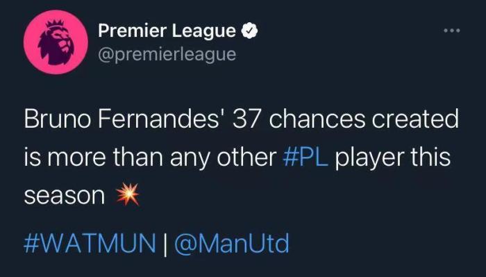 JRS直播网11月20日讯 ,曼联将在本轮英超客场挑战沃特福德。赛前,据英超官方统计,B费本赛季创造机会数为英超球员第一。