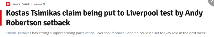 《回声报》表示,顶替罗伯逊位置的自然就会是齐米卡斯,这将是他第4次英超联赛首发。在加盟红军1年后,齐米卡斯逐渐适应,并在此前首发出战的3场英超联赛中均贡献出色表现。