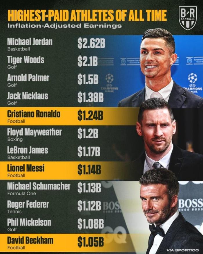 JRS直播网11月06日讯 Sportico日前统计了世界体坛运动员历史收入排行,前十中只有C罗和梅西两名足坛人士。
