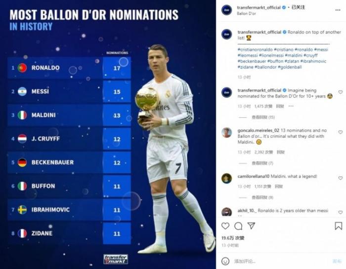 JRS直播网10月31日讯 金球奖不久后就要揭晓,今日,德转盘点了足球史上金球奖提名次数最多的球员,其中C罗17次位居第一,梅西第二。