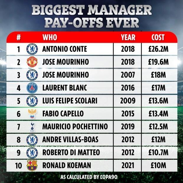 JRS直播网10月29日讯 《太阳报》日前统计了足坛解约金最高的主教练,孔蒂在离开切尔西时拿到2620万英镑排名第一,穆里尼奥则占据第二和第三位。