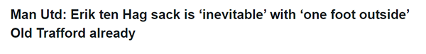 新老板吉姆·拉特克里夫爵士和曼联董事会对滕哈格的耐心已经达到极限,布莱顿的德泽尔比和英格兰队主帅索斯盖特是可能的继任者。英超名宿杰米·雷德克纳普对曼联的表现大肆批评,认为滕哈格的打法让对手看起来犹如皇家马德里。