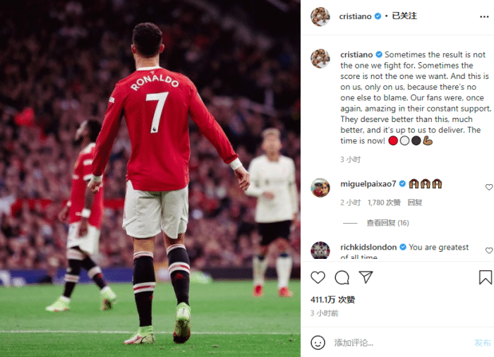 JRS直播网10月25日讯 今天凌晨,曼联在英超联赛中0-5惨败利物浦,赛后C罗在Instagram上发文谈到这场比赛。