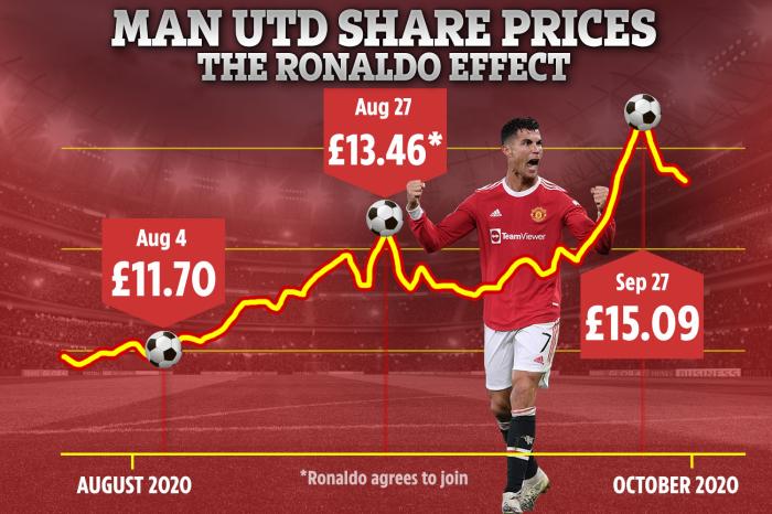 8月4日,曼联的股票价格曾一度下跌到11.70英镑,市值19.1亿英镑;8月26日,曼联的股价有所提升,上升到12.72英镑,总值20.8亿英镑。而在C罗宣布回归后,红魔股票一天内飙升到13.46英镑,市值也涨到了21.9亿英镑。随着C罗球衣大卖等一系列利好消息,加上欧冠资格、球迷回归等因素影响,到了9月27日,曼联的股价已经提升到15.09英镑,市值高达24.6亿英镑。