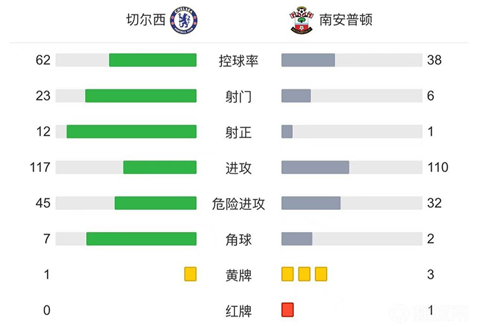 JRS直播网讯:北京时间10月2日22:00,英超第7轮,切尔西坐镇主场迎战南安普顿。上半场,小查洛巴头球破门首开记录,麦卡锡多次作出扑救,卢卡库进球被吹,维尔纳头球破门被吹。下半场,沃德-普劳斯点射破门后染红离场,维尔纳破门再次领先,奇尔韦尔破门扩大比分,全场比赛结束。切尔西3-1南安普顿。