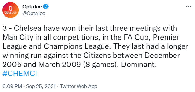 JRS直播网9月26日讯 据OPTA数据统计,切尔西对曼城已经取得3连胜,这是蓝军自2005年-2009年以来对曼城最长的连胜纪录。