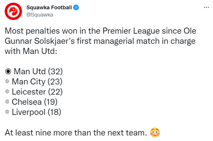 JRS直播网9月25日讯 据知名数据网站squawka统计,自从索尔斯克亚上任后,曼联已经在英超联赛获得32个点球,是所有英超球队中最多的。