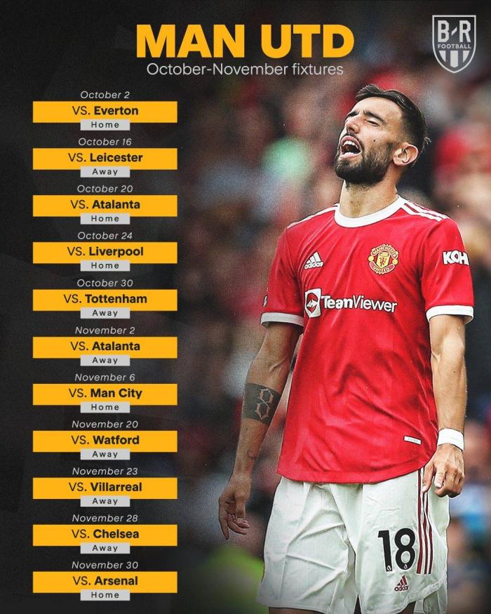 而在11月份,月初的3号曼联将要在欧冠当中迎战亚特兰大。面对这支意甲本土最具进攻属性的球队,曼联是不能放松的。然后在11月6号,曼联将要迎战同城死敌曼城,不客气的说,曼城就是如今英超最具统治力的球队。曼联对上他们并不轻松。 接下来在11月20号,曼联可以稍微松口气,因为他们将要面对联赛下游球队沃特福德。这场比赛对于曼联来说可以适当的做一些调整。而在踢完沃特福德之后,曼联又将要在欧冠当中迎战比利亚雷亚尔。
