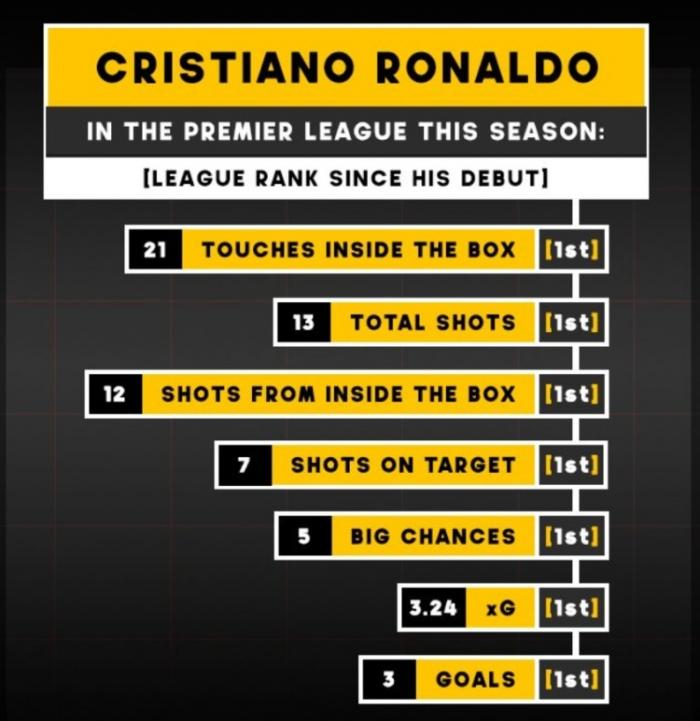 JRS直播网9月21日讯 今年夏天,欧洲转会市场上最令人疯狂的两笔转会无疑就是梅西转会巴黎和C罗转会曼联了。而世界上最好的两名球员转会之后,他们在新东家的表现如何呢?今天来看看C罗在英超的表现如何,而近日就有英格兰媒体盘点了C罗回归曼联之后的比赛数据,他有7项数据位居英超第一,不得不说,C罗绝对是英超独一档的存在,他依然是英超最顶级的球星。