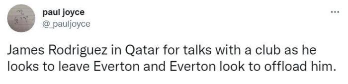JRS直播网讯据英国媒体《泰晤士报》记者PaulJoyce报道,哥伦比亚中场哈梅斯-罗德里格斯正在与一支卡塔尔球队谈判。