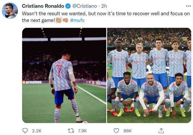 赛后C罗在推特上晒出全队合照,并写道:”这不是我们想要的结果,但现在是时候好好恢复,并专注于下一场比赛了。“