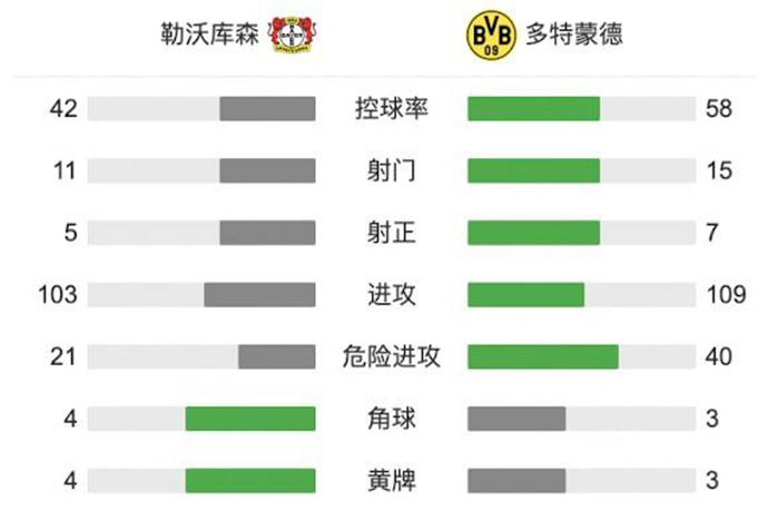 第9分钟,勒沃库森取得领先,多特后场传递时遭到抢断,维尔茨拿球突破至禁区内捅射破门,勒沃库森1-0领先多特蒙德。