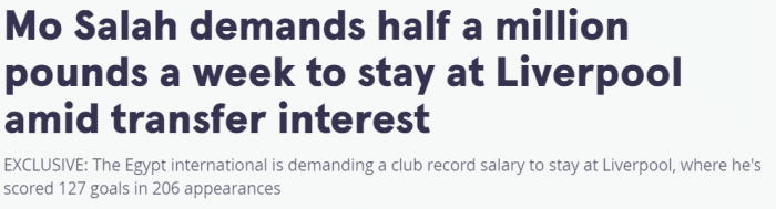 《镜报》称,萨拉赫目前的周薪为20多万英镑,但他要求在续约后得到高达50万英镑的周薪,这遭到了利物浦的拒绝,因为给出这样的薪水意味着利物浦将打破薪资结构,因此现在谈判已经陷入了僵局。