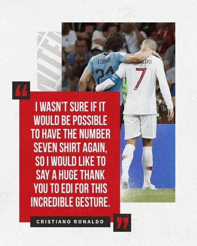 C罗说道:“一开始我不确定自己能否再次穿上7号球衣,但卡瓦尼很大度,把号码让给了我,所以我想对他说一声大大的谢谢。”