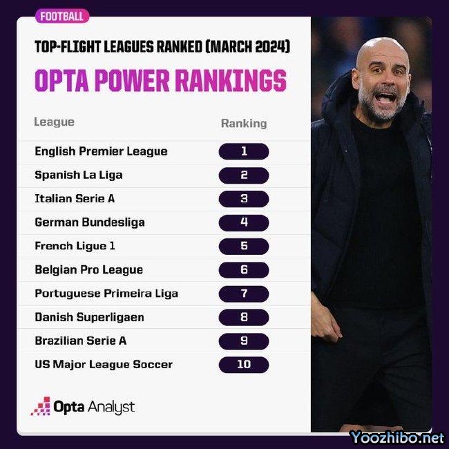 JRS直播网讯 著名数据机构OPTA公布了2024年最新一期的联赛排名,英超毫无疑问地位居榜首。