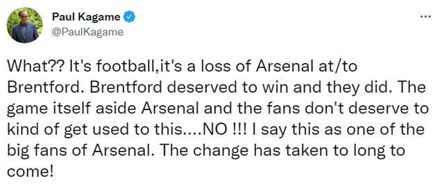 JRS直播网讯 北京时间8月14日,阿森纳在英超揭幕战中0-2不敌升班马布伦特福德。作为阿森纳球迷的卢旺达总统保罗-卡加梅在个人社交媒体上表达了不满。