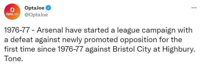 赛后,据知名数据网站Opta统计,这是自1976-77赛季以来,阿森纳首次在联赛首轮输给升班马球队。